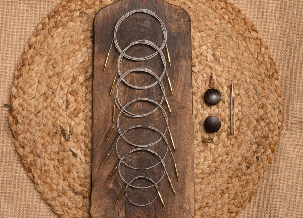 Los cordones circulares fijos de Lantern Moon están hechos de acero inoxidable recubierto de nailon que se desenrolla fácilmente y permanece relajado sin torcerse. El conector de latón macizo chapado en 24K tiene rosca para facilitar su colocación en las puntas de las agujas. Se almacenan fácilmente y vienen en una variedad de longitudes, desde 8” hasta 49”.