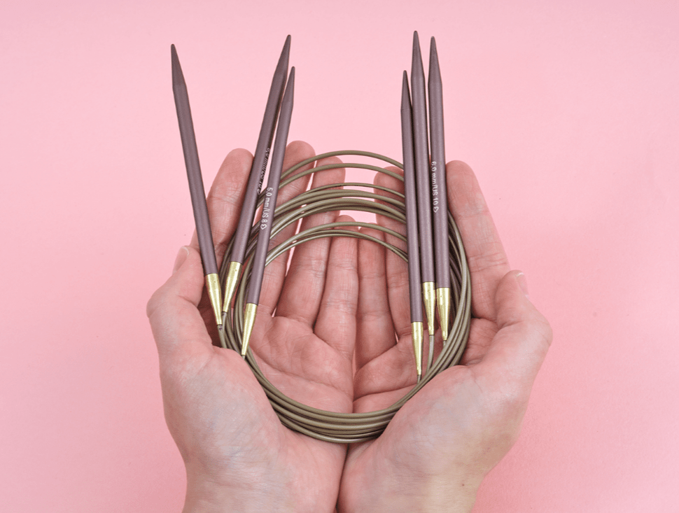 La superficie anodizzata opaca assicura un eccellente controllo: i punti scorrono facilmente ma con più presa rispetto alle punte metalliche lucide — perfetto per chi lavora con tensione morbida o con filati scivolosi. A seconda della luce, la superficie riflette toni viola e bronzo, creando un elegante contrasto soprattutto con i filati chiari.